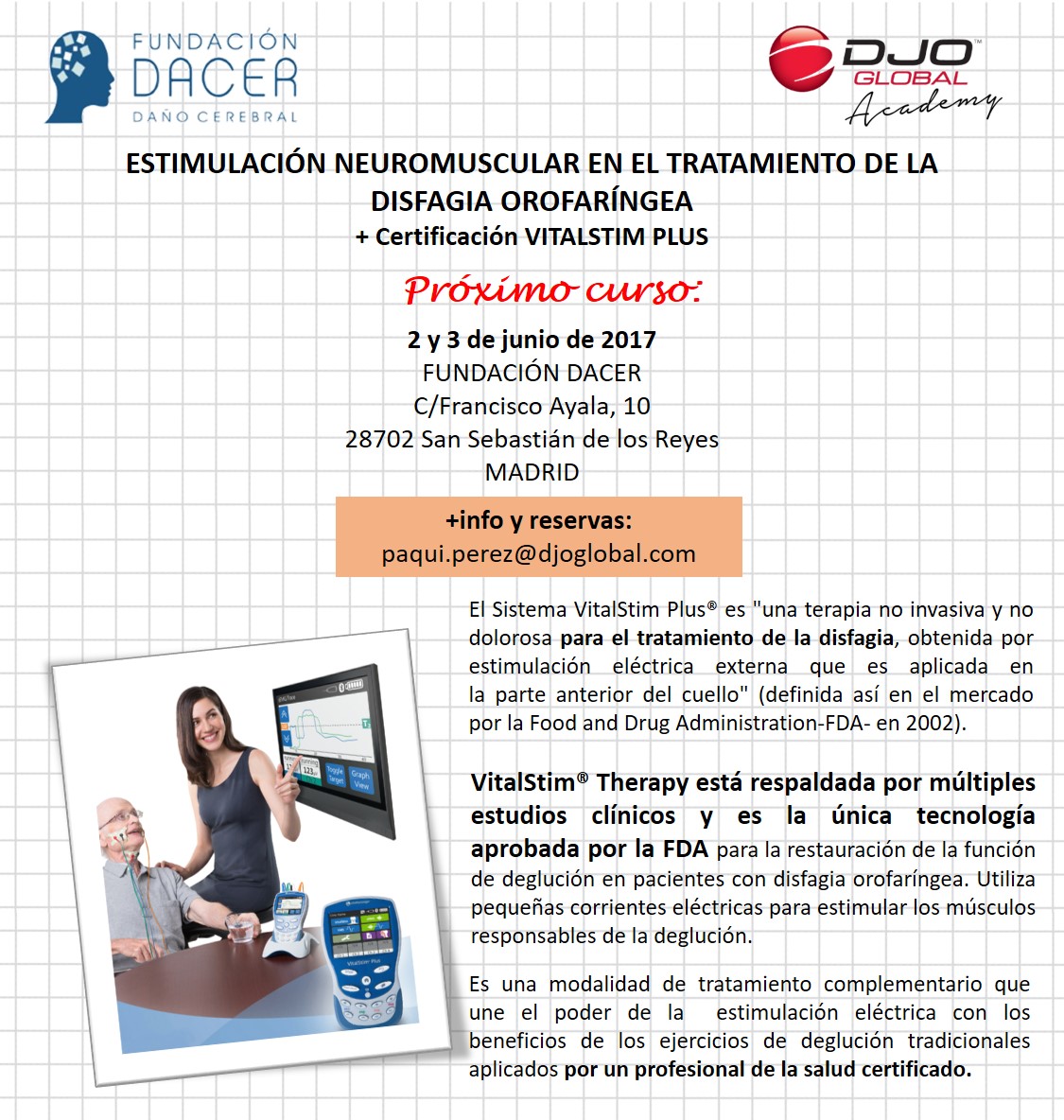 Los próximos 2 y 3 de Junio tendrá lugar en Madrid el curso “Estimulación neuromuscular en el tratamiento de la disfagia orofaríngea”