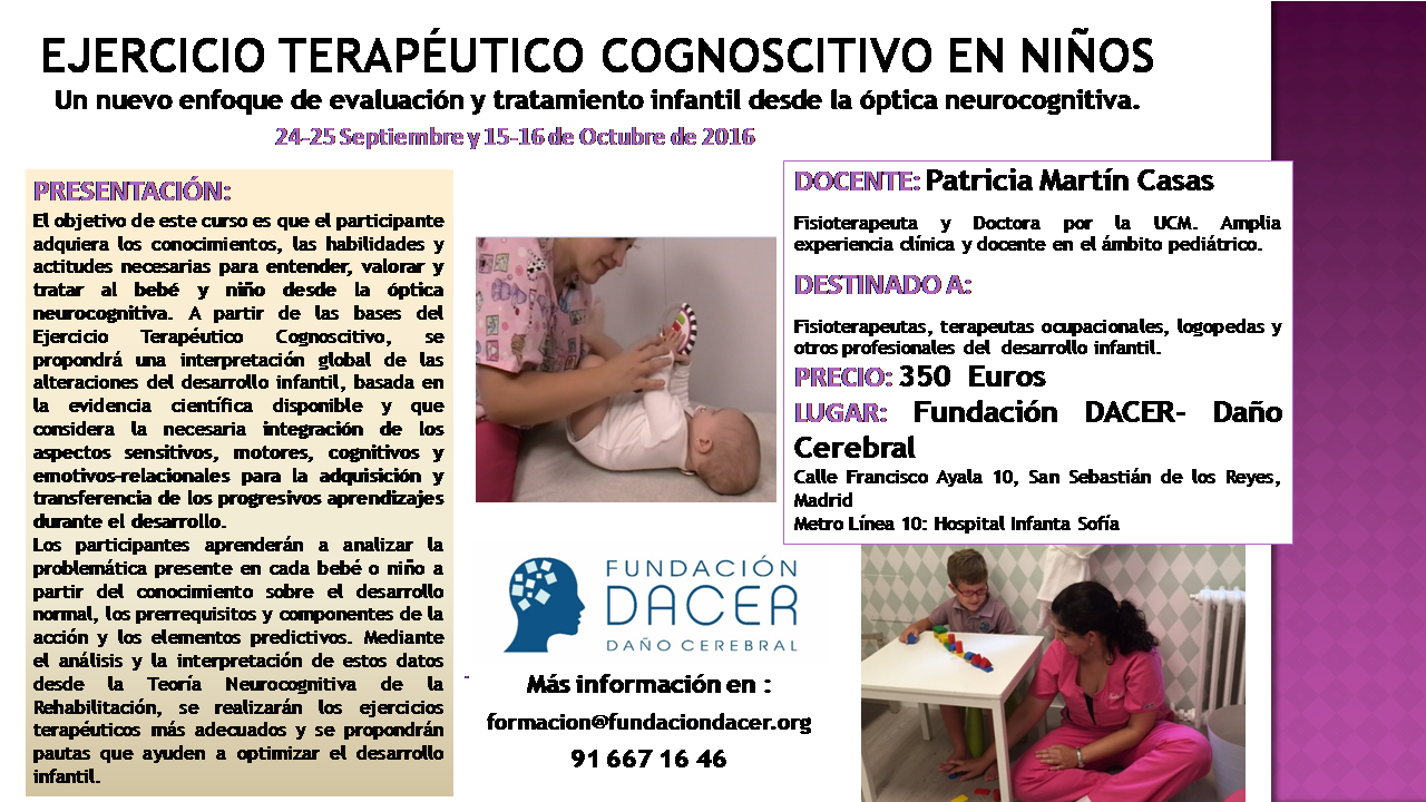 En el ámbito de la rehabilitación infantil, el curso pretende que el participante adquiera los conocimientos, las habilidades y actitudes necesarias para entender, valorar y tratar al bebé y niño desde el enfoque neurocognitivo. Este enfoque, también denominado Ejercicio Terapéutico Cognoscitivo o Rehabilitación Neurocognitiva, inició su desarrollo en los años 70 en Italia a partir de las propuestas del Profesor Perfetti, la Doctora Puccini y sus colaboradores y continúa evolucionando en la actualidad gracias a diferentes grupos de estudio en diversos países.